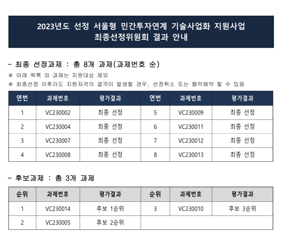 2023년도 서울형 민간투자연계 기술사업화 지원 사업 최종 선정 2026-01-22 0 42 01.22 14:05 루다큐어 과제 번호 VC230007 2023년 11월 1일 부터 2년간 진행 예정이며, 골관절염 통증 치료제 개발을 목표로 합니다. 해당 과제는 IP다래전략사업화센터가 운영사로 해당 과제를 함께 할 예정입니다.
