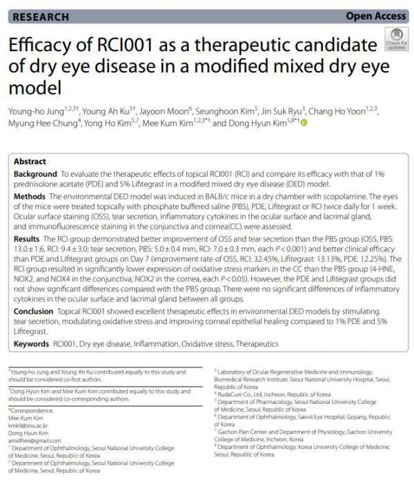 Efficacy of RCI001 as a therapeutic candidate of dry eye disease in a… 2026-01-22 0 46 01.22 14:16 헬스코리아 뉴스: 안암병원 김동현 교수 개발 ‘RCI001’ 안구건조증 치료에 효과적