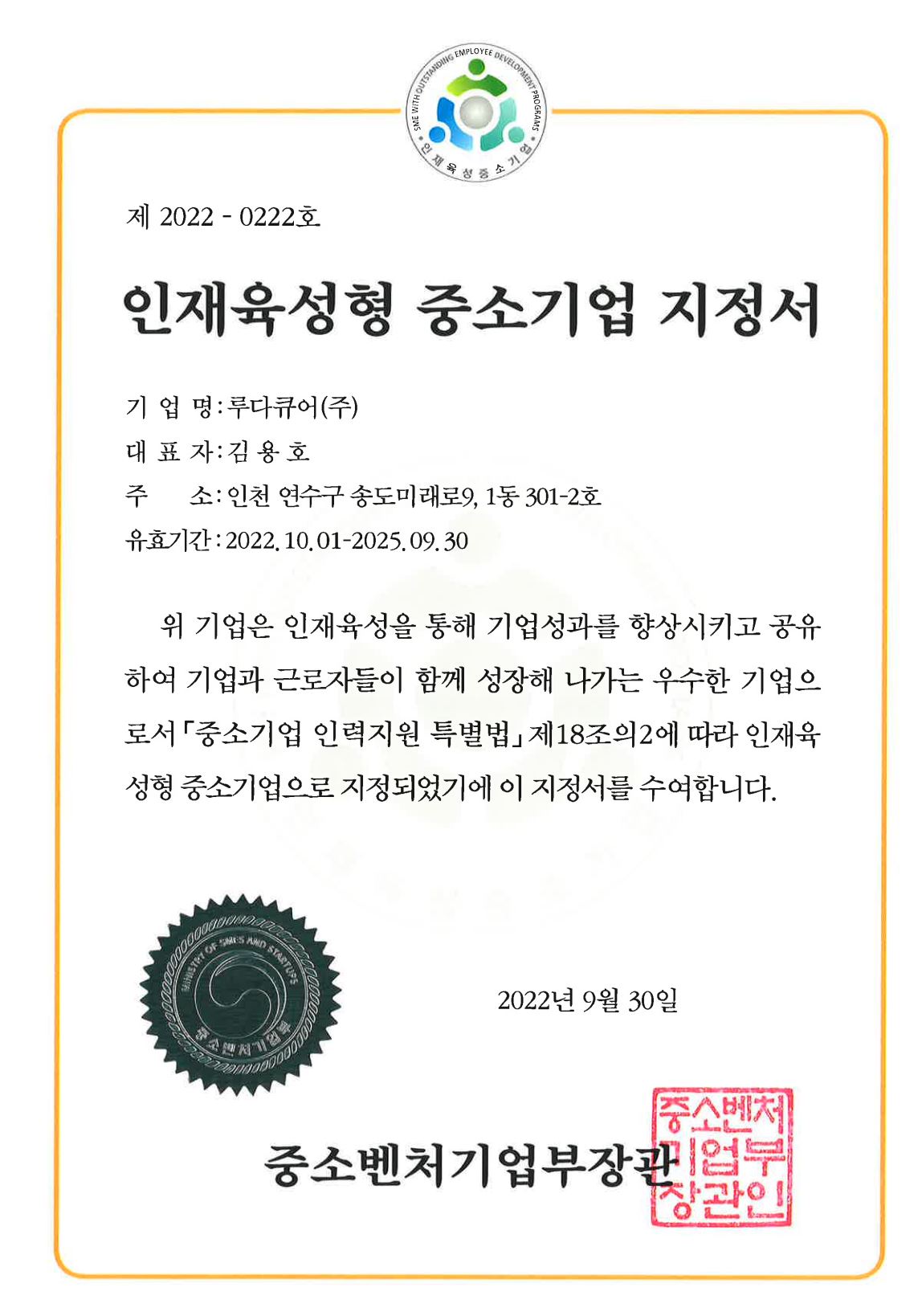 인재육성형 중소기업 선정 2026-01-22 0 44 01.22 12:29 인재에 대한 투자를 통해 기업의 생산성과 수익성을 향상시키고, 그 성과를 직원에게 보상함으로써 기업과 근로자가 함께 선장해 나가는 우수한 중소기업들을 선발하여 인재육성형 중소기업으로 지정하는 중소벤처기업부 인재육성형 중소기업에 루다큐어가 지정되었습니다(2022.10.01~2025.09.30). 그동안 성과를 직원 모두에게 다양한 방법을 통하여 보상하려고 하였던 노력의 결실로 여겨집니다. 주주여러분들의 도움으로 얻어진 성과에 감사드립니다.
