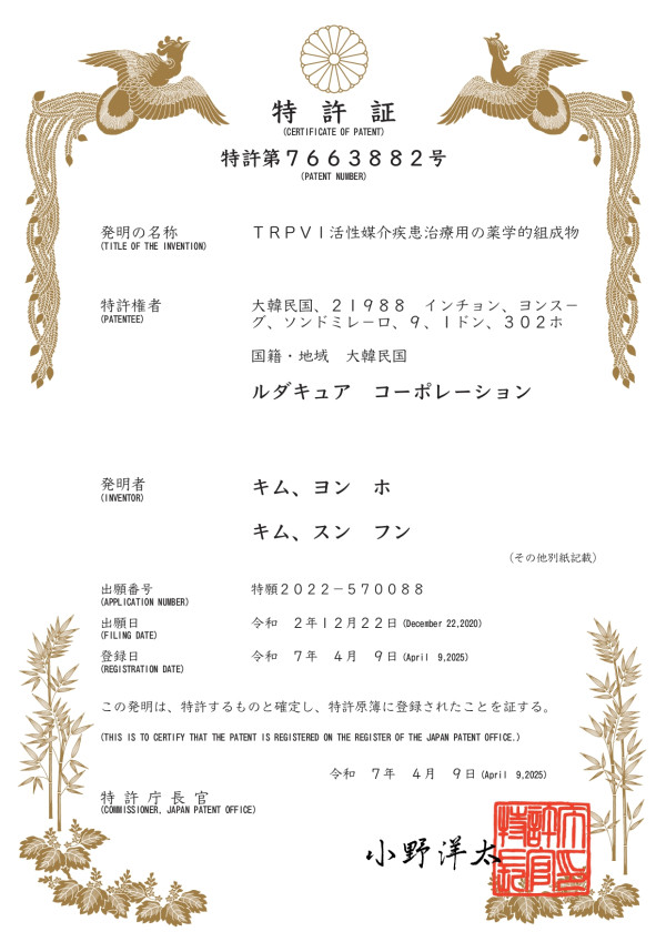 [특허] PATENT NUMBER 7663882 2026-01-23 0 26 01.23 17:43 2026.01.23 17:43 루다큐어_RCI002 용도 일본 특허_특허증.pdf (385.5K) + 0 내인성 단백질을 이용한 통증 치료 기술