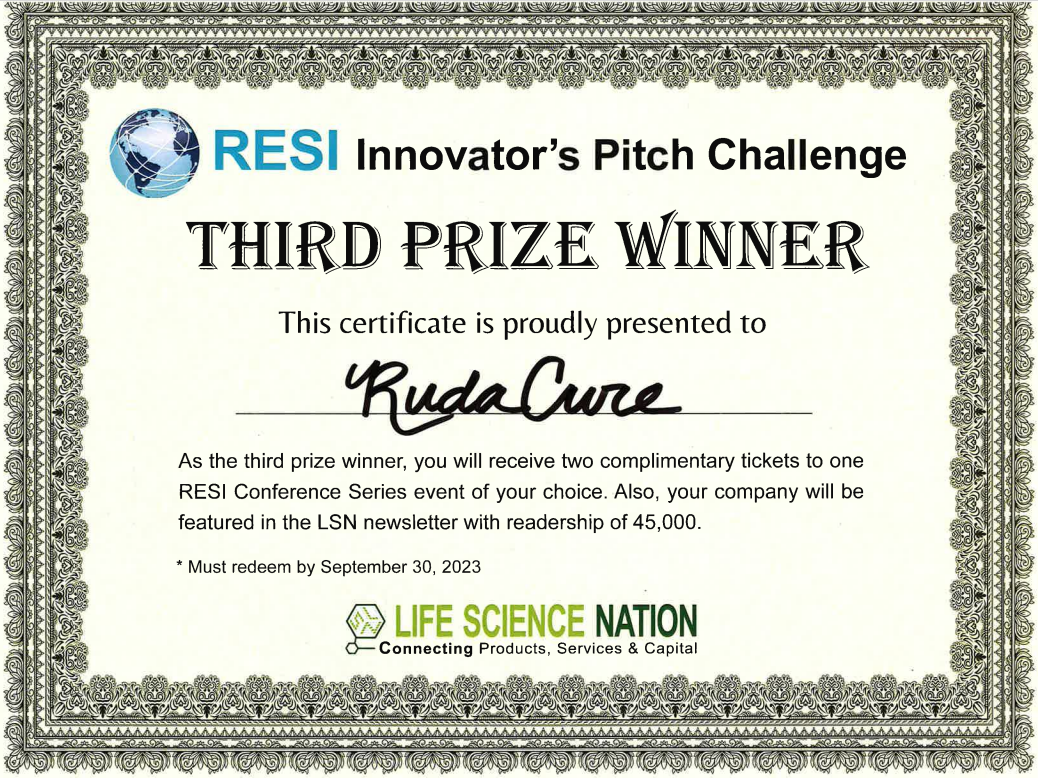 RudaCure participated in the RESI (Redefining Early Stage Investments) Conference and was selected as 3rd place out of 70 companies in the Innovator's Pitch Challenge.