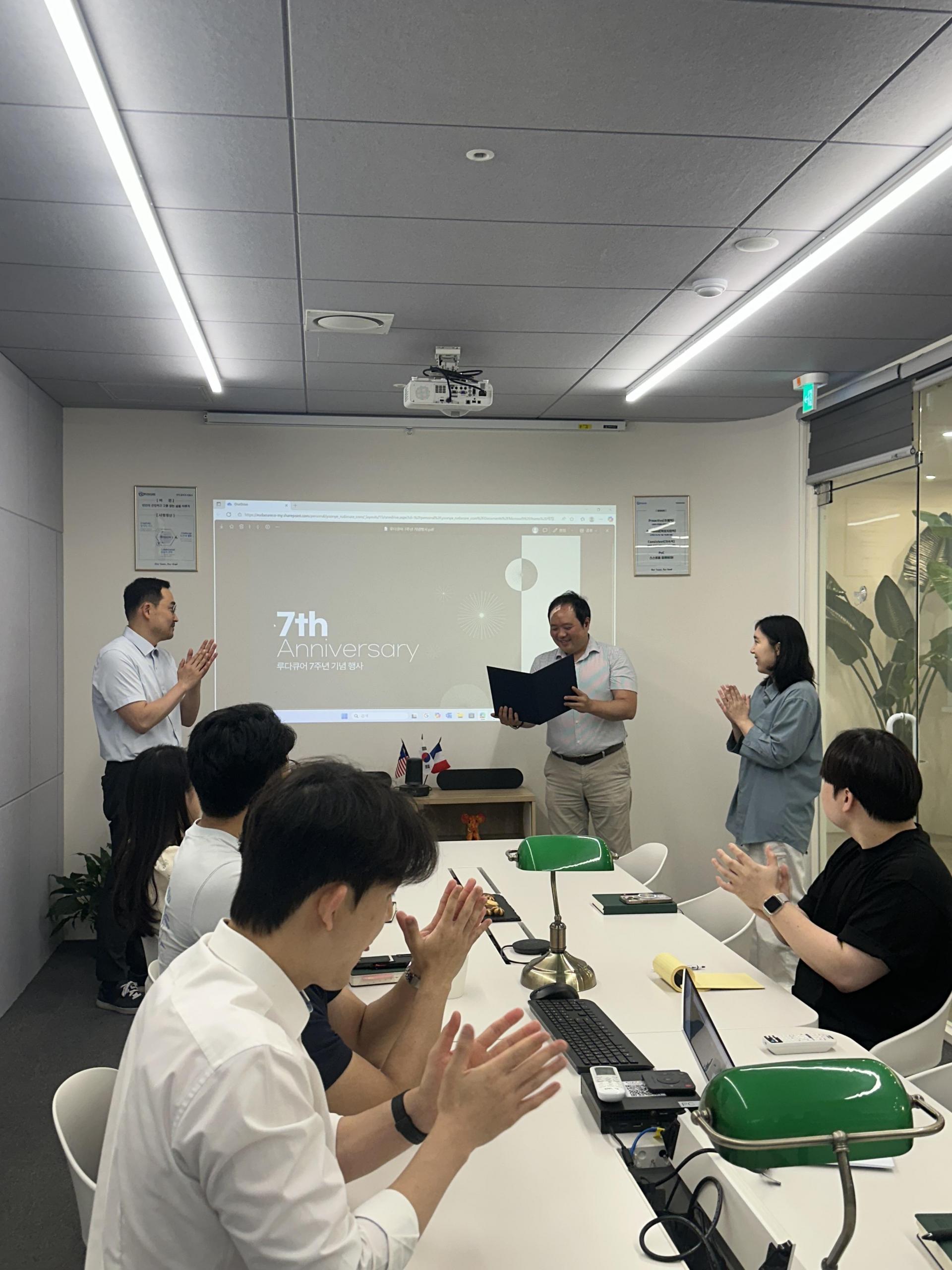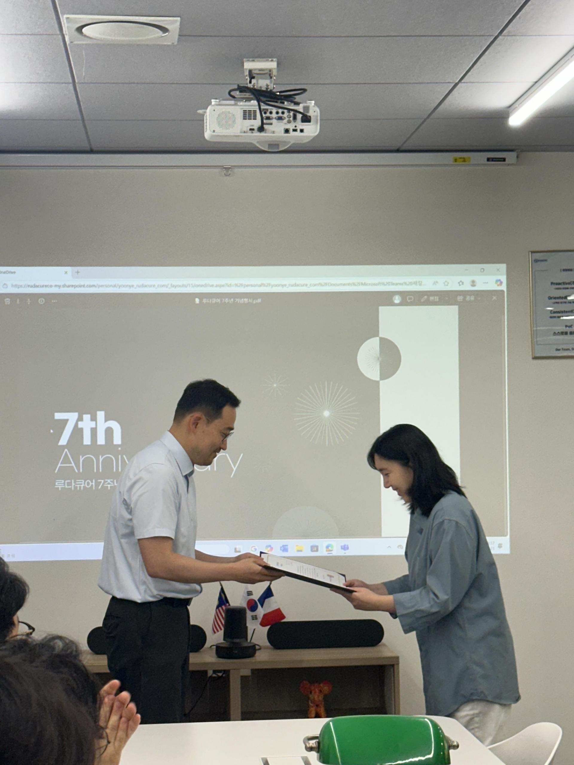 RudaCure held an 'Anniversary Ceremony' with its employees on July 21, 2025, to celebrate its 7th founding anniversary on July 23, 2025. This ceremony was organized to express gratitude and celebrate three employees who have served for 5 years as of 2025 — Efficacy Research Team Manager Young-ah Ku, Management Planning Office Assistant Manager Jihee Ryu, and Management Planning Office Assistant Manager Yejin Yoon — who have been part of RudaCure's growth and challenges over the past five years. Beyond a formal award ceremony, it was conducted in a warm atmosphere filled with sincere encouragement and congratulations from colleagues.