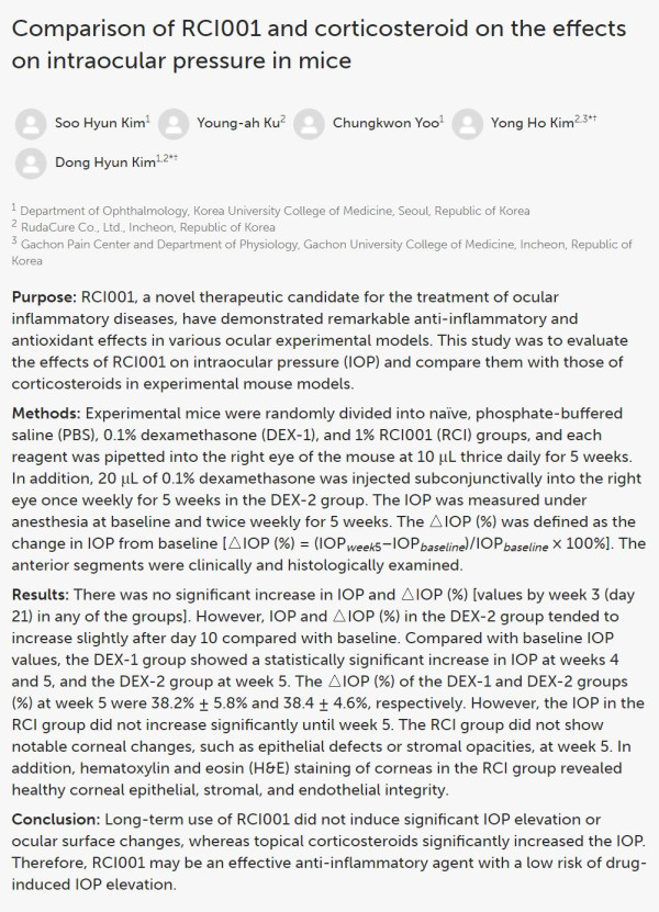 Comparison of RCI001 and corticosteroid on the effects on intraocular … 2026-01-22 0 187 01.22 14:03 Comparison of RCI001 and corticosteroid on the effects on intraocular pressure in mice