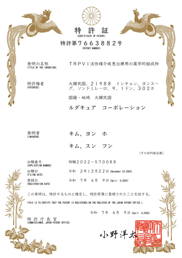 루다큐어, TRPV1 타깃 비마약성 진통제 일본 원천 특허 등록 완료