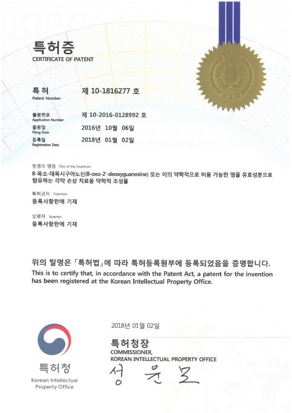 [특허] 제 10-1816277 호 2026-01-23 0 99 01.23 17:34 2026.01.23 17:34 루다큐어_RCI001 용도 한국 특허_ 특허증.pdf (430.5K) + 0 안구건조증 등 각막 질환에 대한 치료 기술